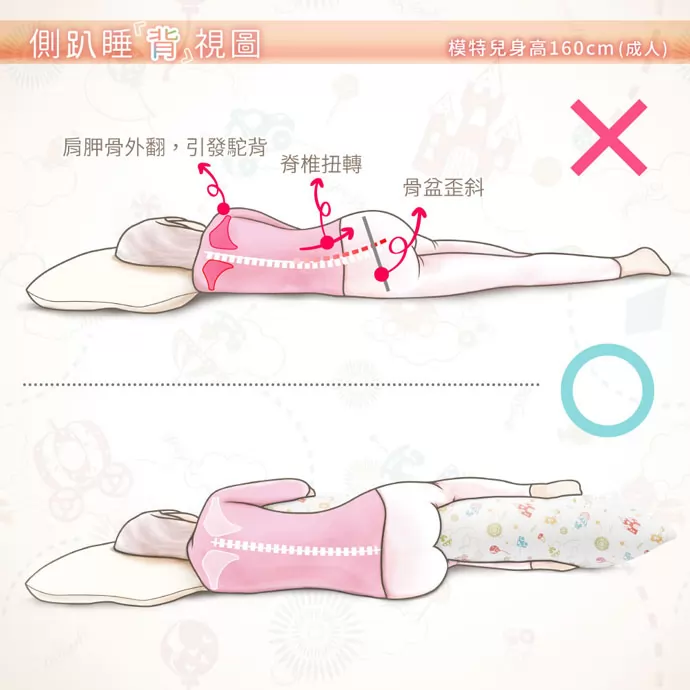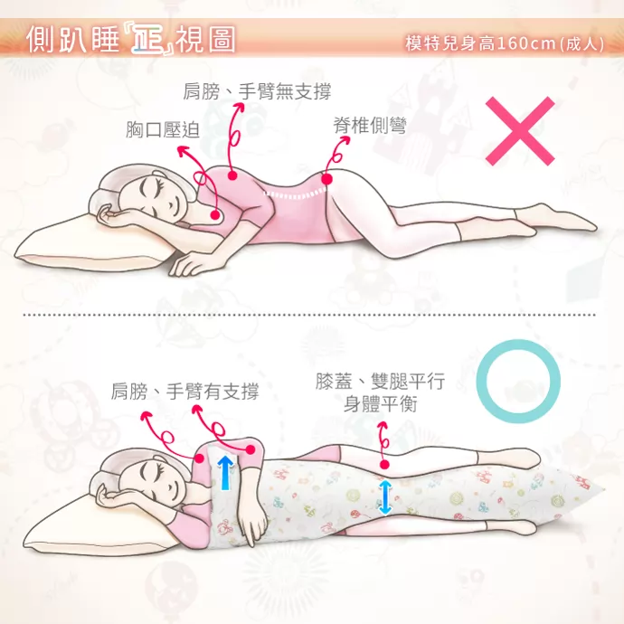 側趴睡正視圖-模特兒身高160cm (成人)側趴睡時手該怎麼放才不會壓迫胸口?腿該怎麼擺才能保持骨架平衡?