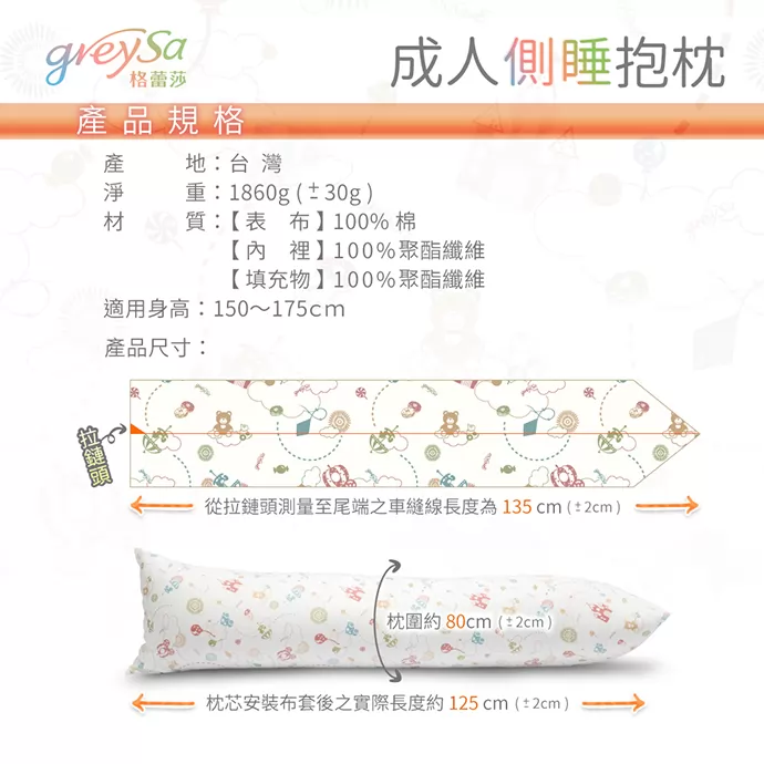 GreySa格蕾莎成人側睡抱枕產品規格: 產地:台灣