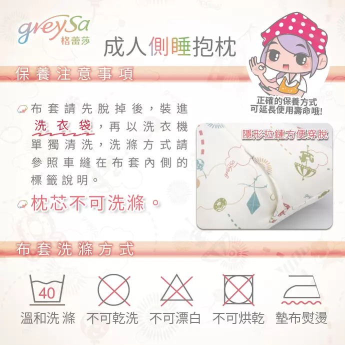 GreySa格蕾莎【成人側睡抱枕】布套請先脫掉後,裝進洗衣袋,再以洗衣機單獨清洗,洗滌方式請參照車縫在布套內側的標籤說明。