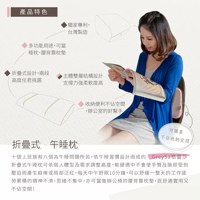 十個上班族有八個為午睡問題所苦,依午睡習慣設計而成的GreySa格蕾莎折疊式午睡枕,可依個人體型及需求調整高度,軟硬適中不會使手臂及臉部受到壓迫而產生麻痺或局部泛紅,每天中午舒眠10分鐘,可以舒緩一整天的工作疲勞累積的精神不濟、思緒不集中,亦可當做辦公椅的腰背靠枕墊,既舒適實用又不佔空間!