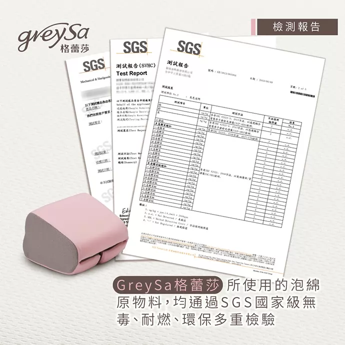 關於檢測GreySa格蕾莎所使用的泡棉原物料,均通過SGS國家級無毒、耐燃、環保多重檢驗
