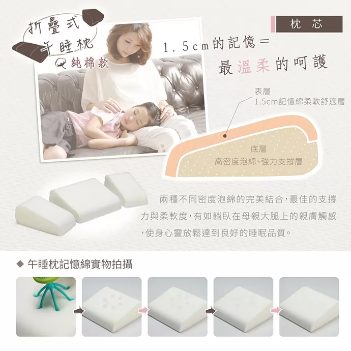 關於布套 40支雙面純棉布與記憶綿的完美結合,營造出肌膚般的觸感,午睡時能夠放鬆地進入深層睡眠。