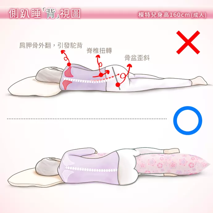 側趴睡因為肩膀及手臂無支撐,可能導致胸口壓迫,連帶造成駝背;腿部無支撐,身體長時間扭轉,睡姿不良可能導致脊椎側彎及骨盆歪斜。