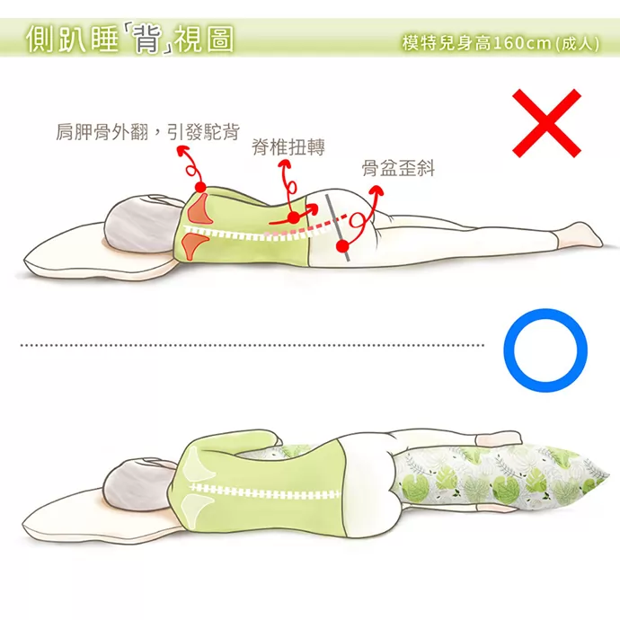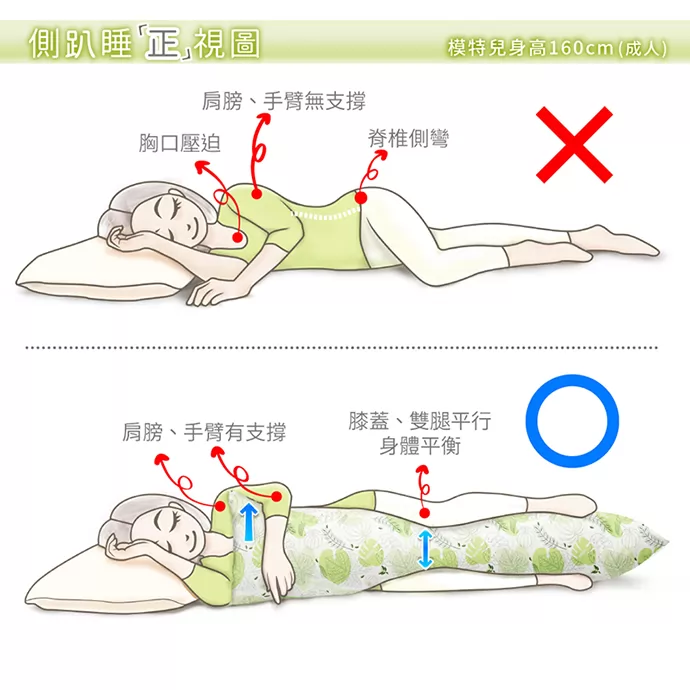側趴睡正視圖-模特兒身高160cm (成人)側趴睡時手該怎麼放才不會壓迫胸口?腿該怎麼擺才能保持骨架平衡?