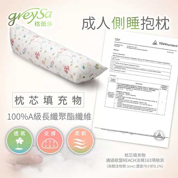 GreySa格蕾莎成人側睡抱枕的枕芯填充物採用100% A級長纖聚酯纖維