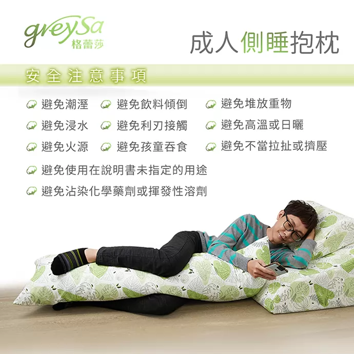 GreySa格蕾莎【成人側睡抱枕】安全注意事項:避免潮濕/避免浸水/避免火源/避免堆放重物/避免飲料傾倒/避免利刄接觸/避免高溫或日曬/避免不當拉扯或擠壓/避免使用在說明書未指定的用途/避免沾染化學藥劑或揮發性溶劑