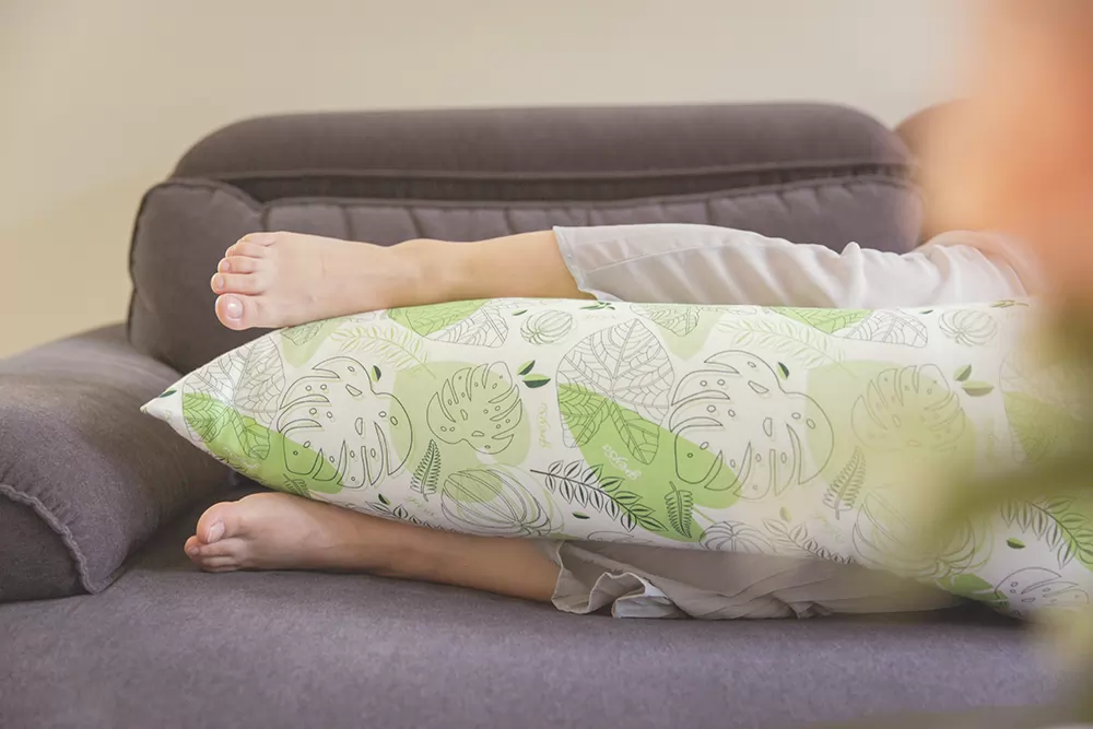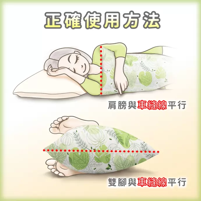 上高下低的設計,只要轉個方向,就能馬上調整成自己需要的高度,上側較高可以讓肩膀、手臂有可以放置的支撐,而非過往的懸空,導致壓迫到胸部使得呼吸不順等情形;下側較低可以讓雙腳平行擺放,而且因為有柔軟抱枕在中間,不會讓雙腳因為側睡互壓痠麻而無所適從,兩隻腳都可以安然放鬆擺放,身體也比較不會因為側睡長時間扭轉而有身體感覺卡卡的情形!