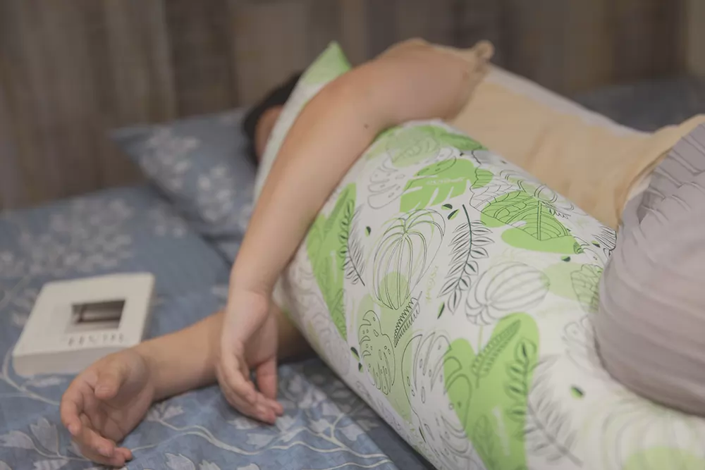 不只是在客廳沙發,有賴格蕾莎的成人側睡抱枕,讓米媽我在房間內也可以安穩地側睡著,從背後可看出身體不再歪曲,側睡抱枕支撐著肩膀、手臂、膝蓋與腿部,讓身體呈現一直線,有更好的睡眠品質。