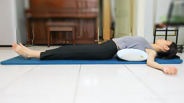 ◎步驟一:將枕頭放在胸部相對位置下方,停留五分鐘(和瑜伽一樣,伸展不宜太久,過度伸展對身體不好,也容易受傷喔!)